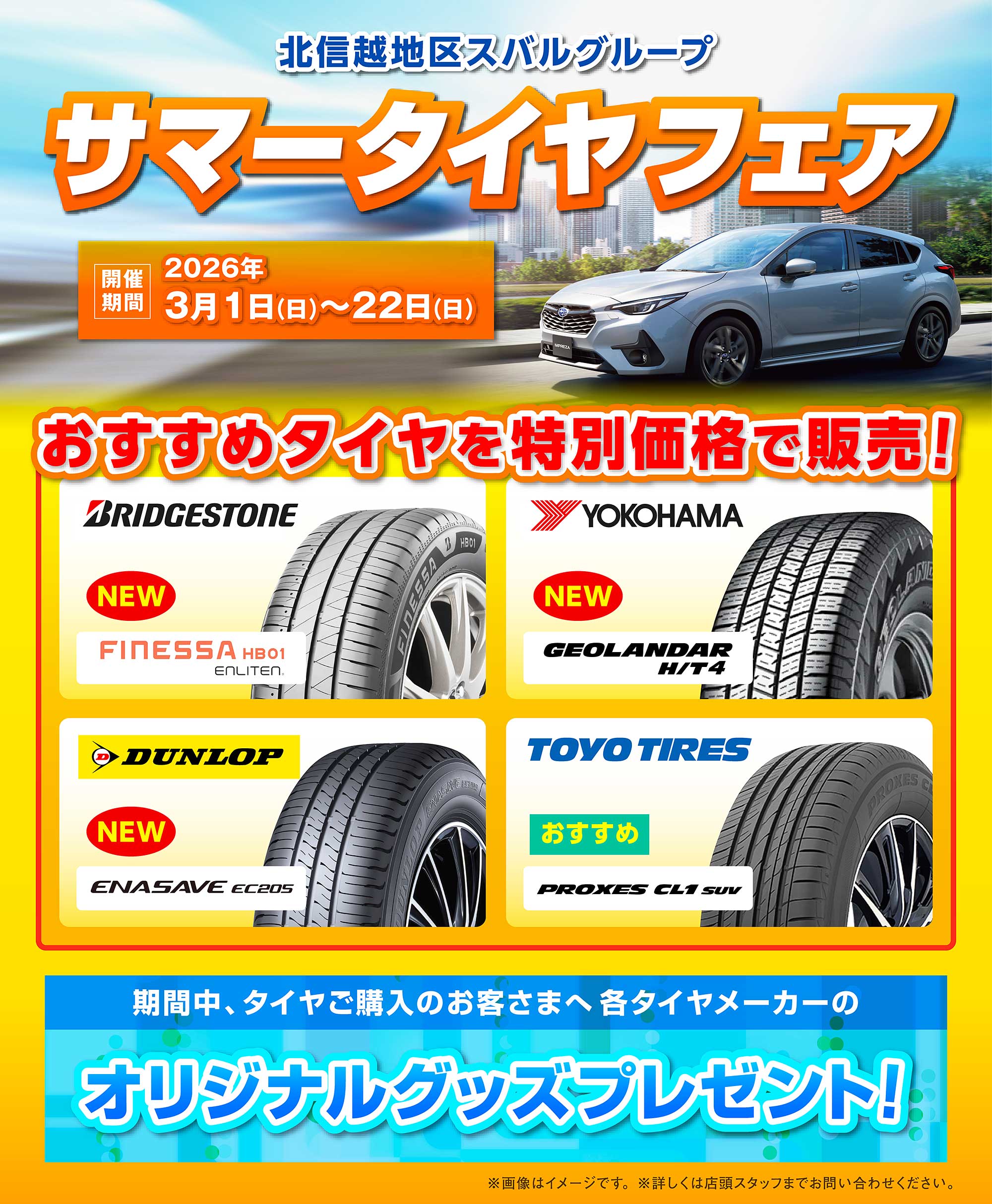 2026年3月1日(日)~22日(日)まで北信越地区スバルグループでは、「サマータイヤフェア」を開催します!